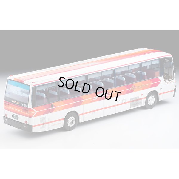 帝産観光バスは東京都品川区に本社を置く大手貸切バス事業者で、暖色系のパターンカラーやグレイハウンドのマークでお馴染みです。多数が導入された同社のエアロバスは、VTRテレビやカラオケ装置を完備。東京、京都、大阪といった各営業所に配置され、バスツアーブームとともに全国を駆け巡りました。ガイド窓付きドア、青ガラス、メッキのスチールホイールといった帝産観光ならではのディテールも見逃せないポイントです。TLV各種と並べて往年のハイウェイシーンをお楽しみ下さい。