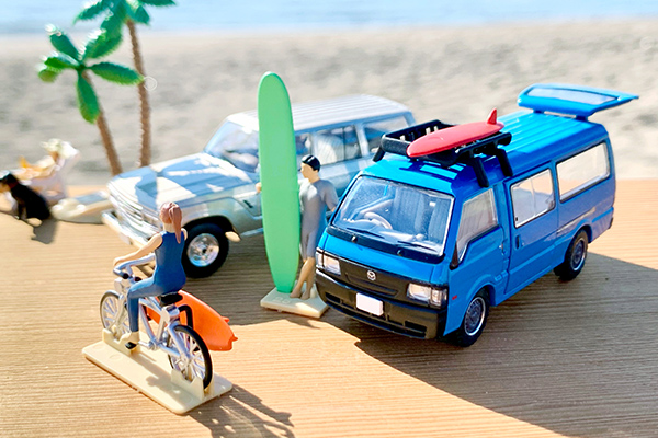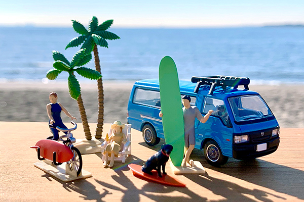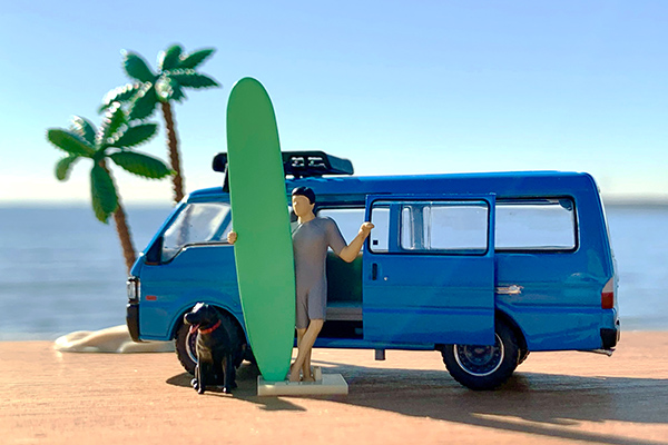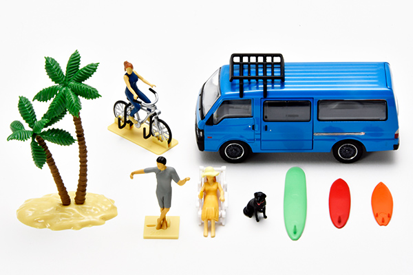 最近、SNSでにわかに盛り上がっている、ミニカーやトイを使った「映え」写真。単に撮影するだけでなく、フィギュアや情景アイテムと組み合わせるなど、いろいろな工夫を楽しむ人たちが増えています。そこでトミーテックが提案するのが、1/64スケールのジオコレ64 #カースナップです。今回は「サーフィン」をテーマとしたフィギュア・小物のセットです。マツダ ボンゴブローニイのミニカーが専用カラーで付属します。