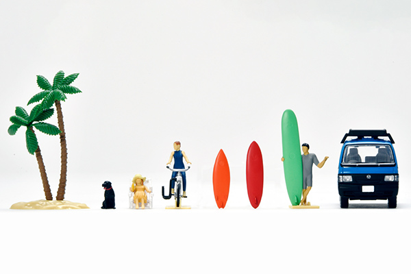 「サーフィン」をテーマにしたフィギュア・小物のセット。サーファーのフィギュア、3種のサーフボード、ビーチクルーザー、ヤシの木などが付属します。ミニカーの荷室にサーフボードを置くことが可能です。立ち姿のフィギュアやビーチクルーザーには、立たせるのに便利な台座がそれぞれ付属するのでお手軽にお楽しみ頂けます。