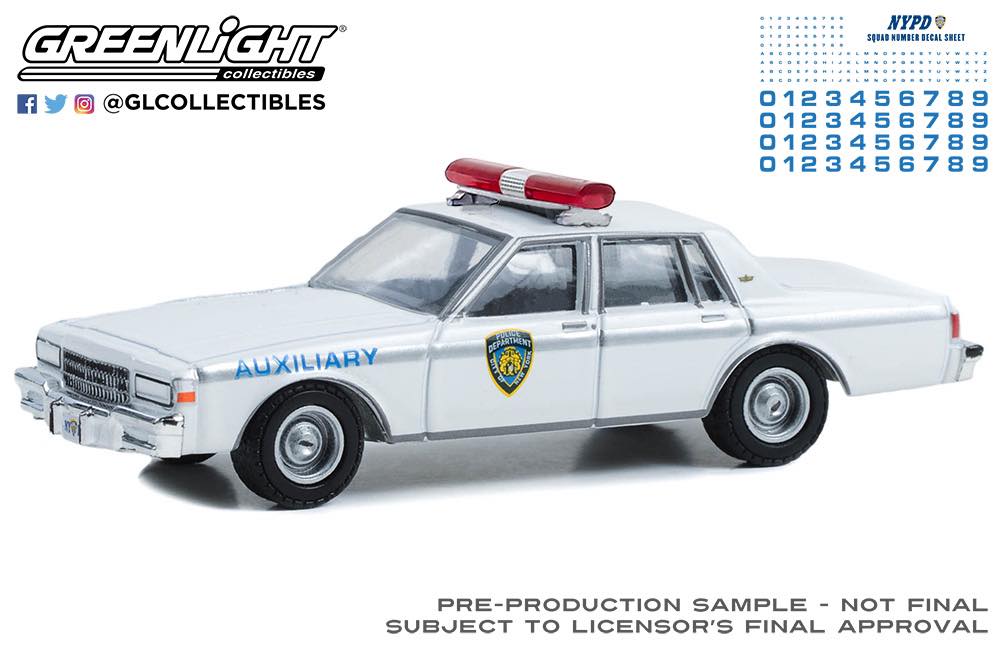 GREEN LiGHT 1/64 Hot Pursuit - 1989 Chevrolet Caprice - NYPD Auxiliary with NYPD Squad Number Decal Sheet