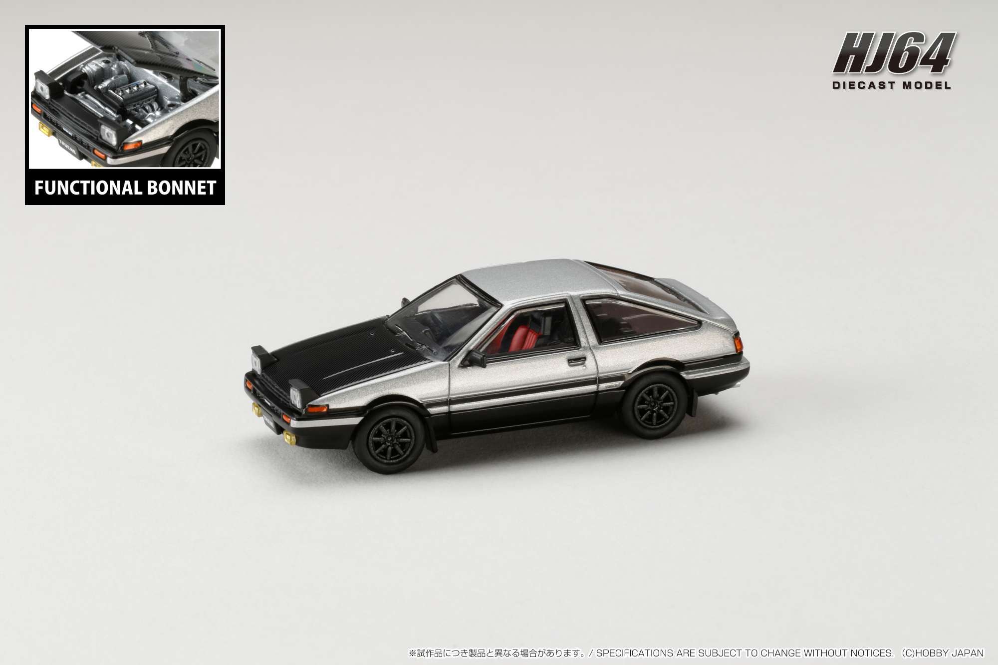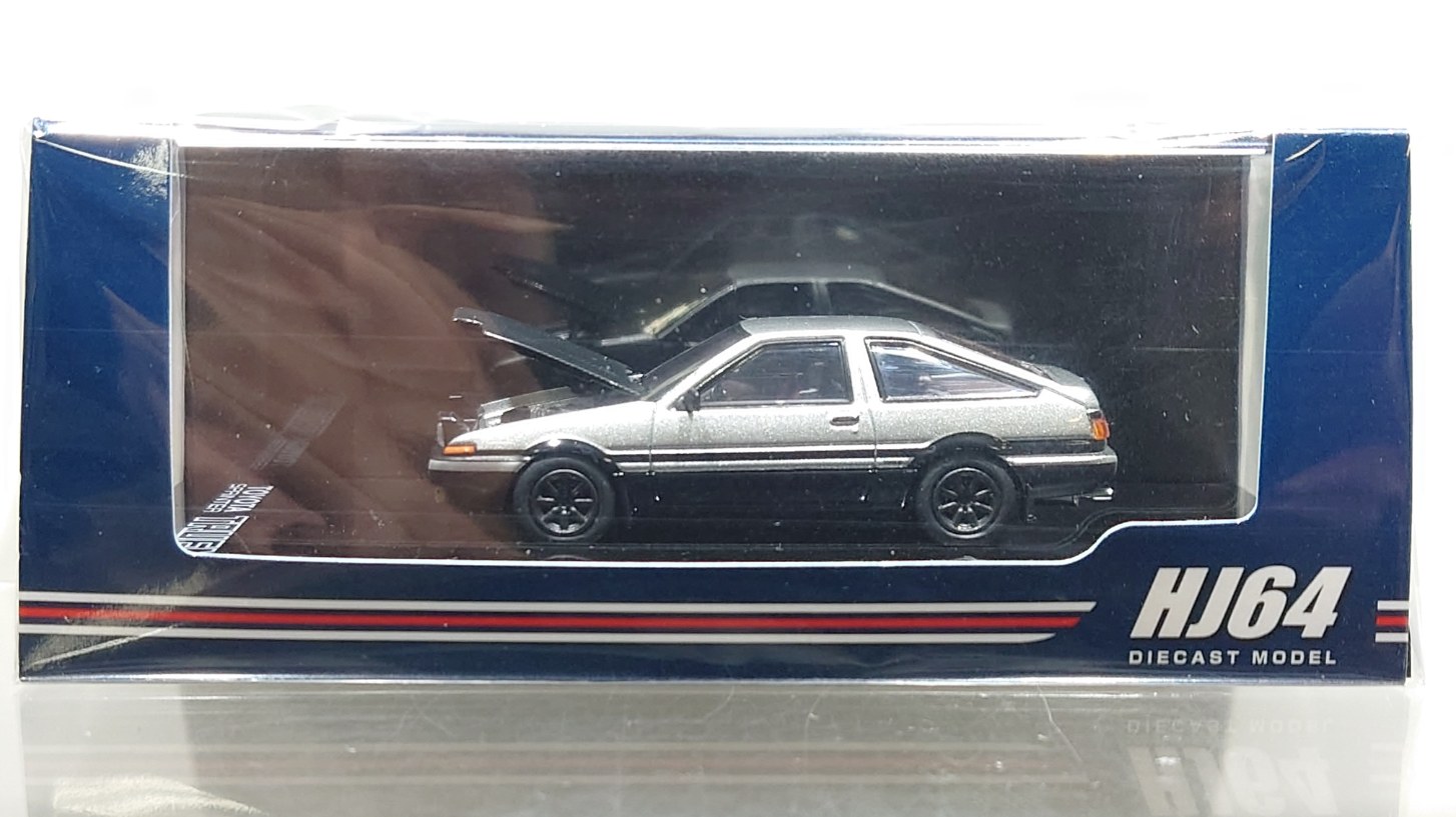 ホビージャパンの1/64ダイキャストシリーズ"HJ64"から トヨタ スプリンター トレノ GT APEX (AE86) JDM Style カーボンボンネット の登場です。