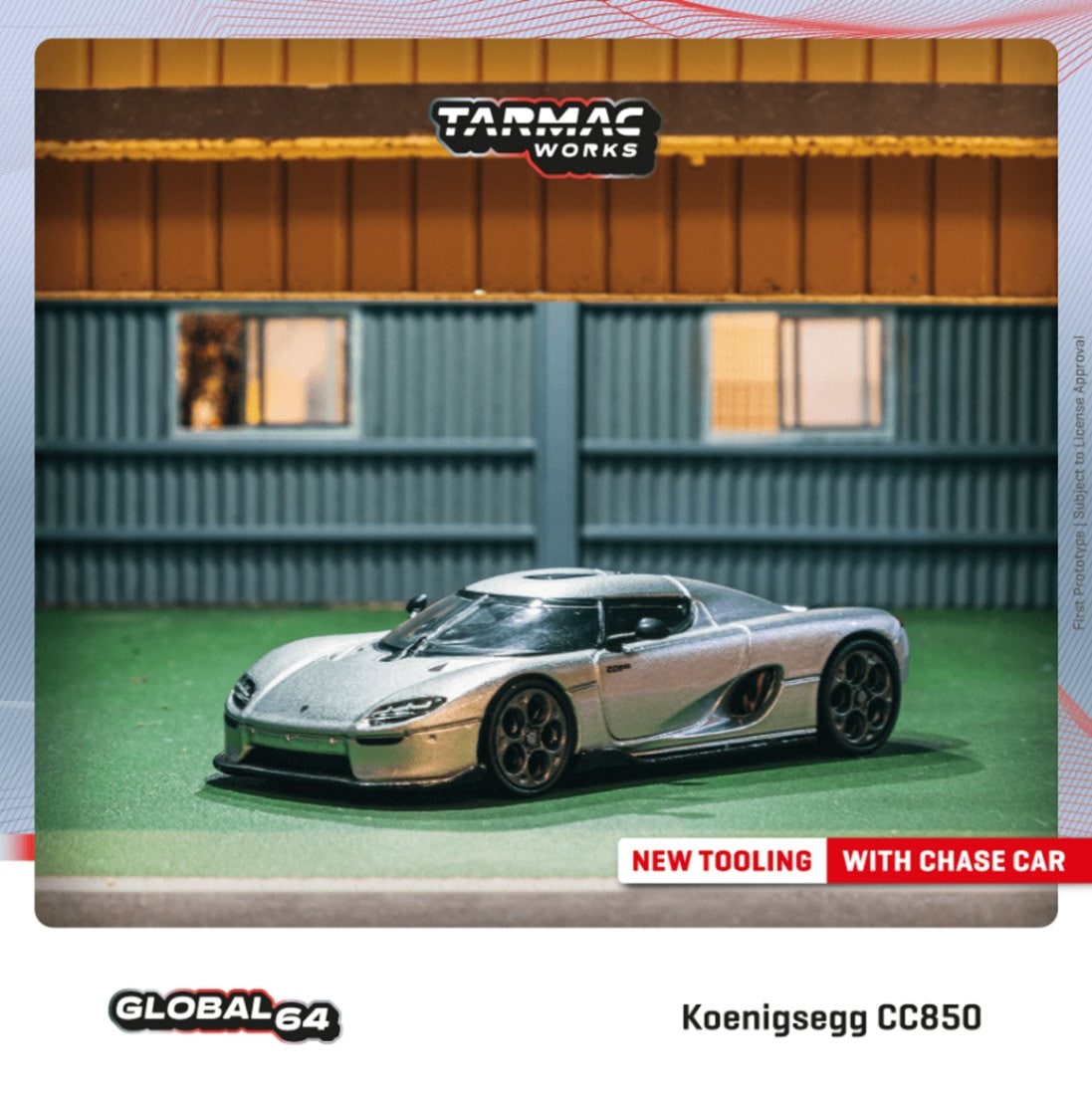 「ケーニグセグCC850」を1/64スケールダイキャスト素材でモデル化。ライト類、ミラー、は別パーツとし、マーク類はタンポ印刷とデカールで再現しました。パッケージは紙箱タイプです。