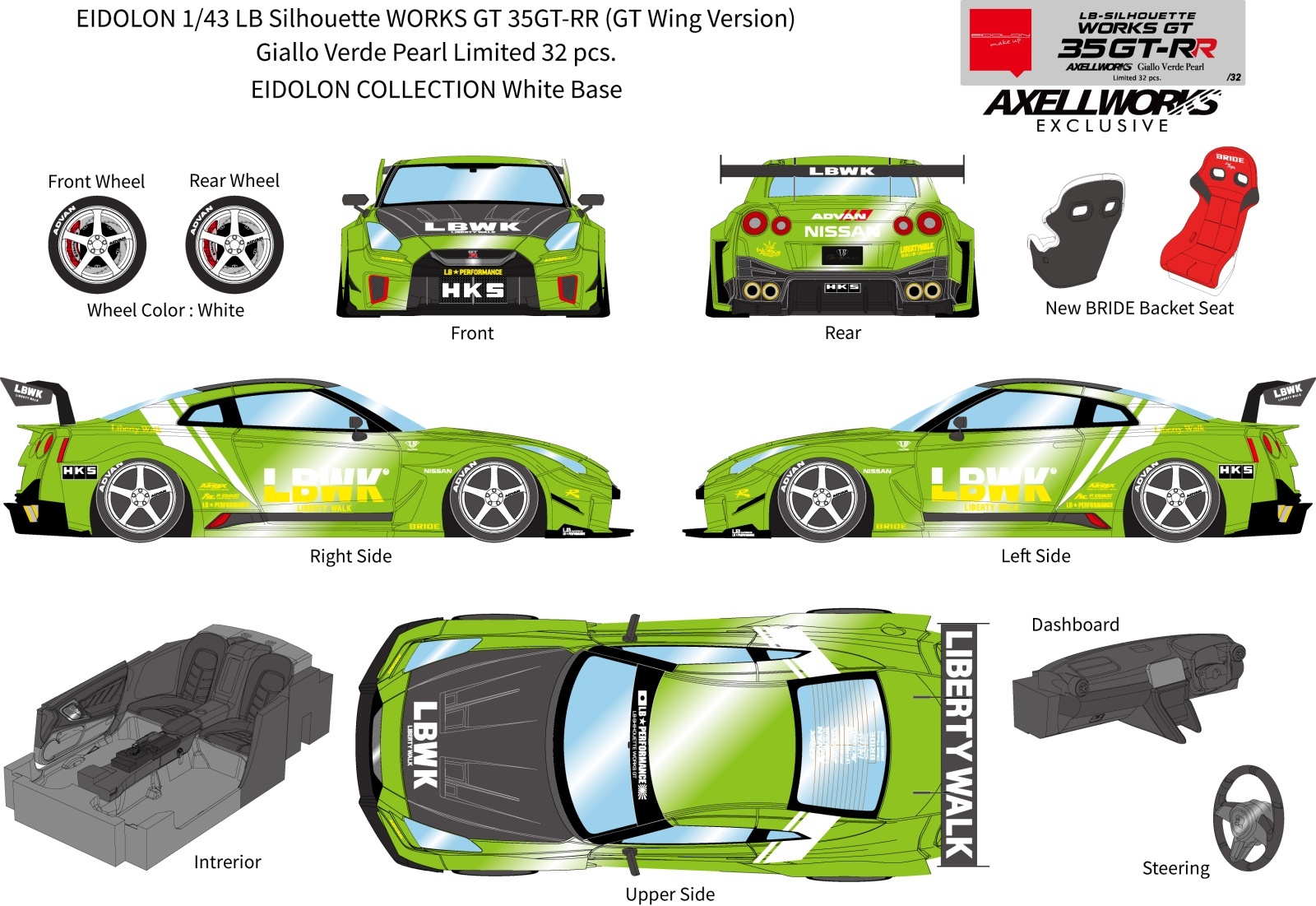 EIDOLON 1/43 LB Silhouette WORKS GT 35GT-RR (GT Wing Version) Giallo Verde Pearl Limited 32 pcs.